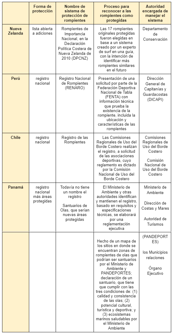 Entre los cuatro países representados en este análisis, hay dos formas diferentes de proteger a las rompientes: un registro donde pueden ser inscritas las rompientes protegidas y una lista establecida por una declaración política que ya enumera las rompientes protegidas. Los dos modelos son manejados por autoridades diferentes y cuentan con procesos diferentes para que puedan incluir a más rompientes.