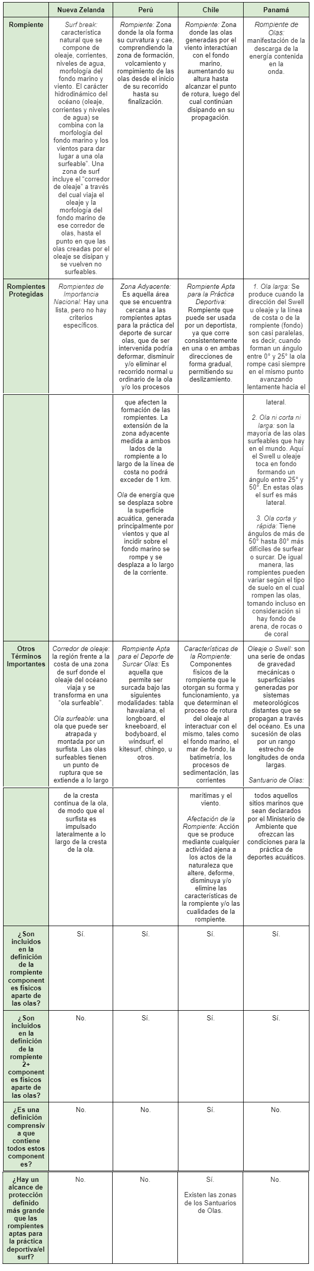 Cada uno de los ejemplos presenta una definición diferente de las rompientes, que afectan al nivel de protección legal que reciben. Es importante resaltar que éstos sólo proveen definiciones con el fin de proteger las rompientes aptas para la práctica deportiva; no hay ninguna norma que proteja a las rompientes en general o además de los deportes de surf, aunque algunas de estas normas reconocen la importancia de conservar las zonas marino-costeras que contienen las rompientes. También es posible identificar dos tipos de definiciones de estas rompientes protegidas: (1) definiciones generales, que describen las rompientes de una manera básica sin reconocer a todos sus componentes físicos, específicamente los cinco componentes que ya han sido identificados en otra sección de este sitio web; y (2) definiciones específicas, que reconocen a estos componentes por la definición principal de la rompiente y/o por otras definiciones suplementarias. Como se puede ver, por este análisis y la tabla que incluye, la definición del proyecto de ley chileno representa la segunda categoría de definición, mientras las de las normas reales y propuestas en Perú y Panamá representan la primera categoría. Dentro de la segunda categoría es posible ver un rango de niveles de detalle en las definiciones de las rompientes, por empleo del reconocimiento de los componentes físicos o áreas correspondientes, así como distintos tipos de rompientes, que pueden también hacer las definiciones en la práctica más o menos comprensivas.