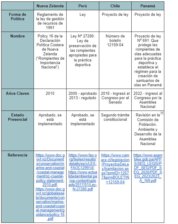 En Perú, en el año 2001, se aprobó la conocida Ley N° 27280 de Preservación de las Rompientes Apropiadas para la Práctica Deportiva. En el 2013, se promulgó su reglamentación (foto de referencia). A la fecha, se han protegido 48 rompientes en el Perú, a lo largo de toda la costa del país. Chile está siguió el mismo proceso y su ley fue promulgada en el año 2025.