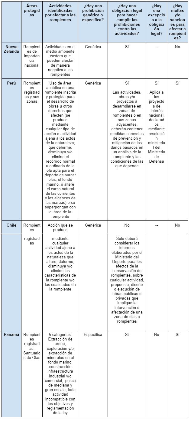 En esta sección de análisis, se abordan las similitudes y diferencias más importantes entre estos cuatro casos de normas establecidas o propuestas en Perú, Chile, Panamá y Nueva Zelanda, para proteger explícitamente y a nivel nacional a las rompientes. La meta es aumentar un entendimiento de las ventajas y desventajas de cada modelo, para informar sobre los esfuerzos de protección legal de las rompientes que ya están progresando, como ocurre en Ecuador, y surface arán en el futuro. De esta manera, el análisis pretende iluminar los componentes ideales de una norma para proteger a las rompientes.