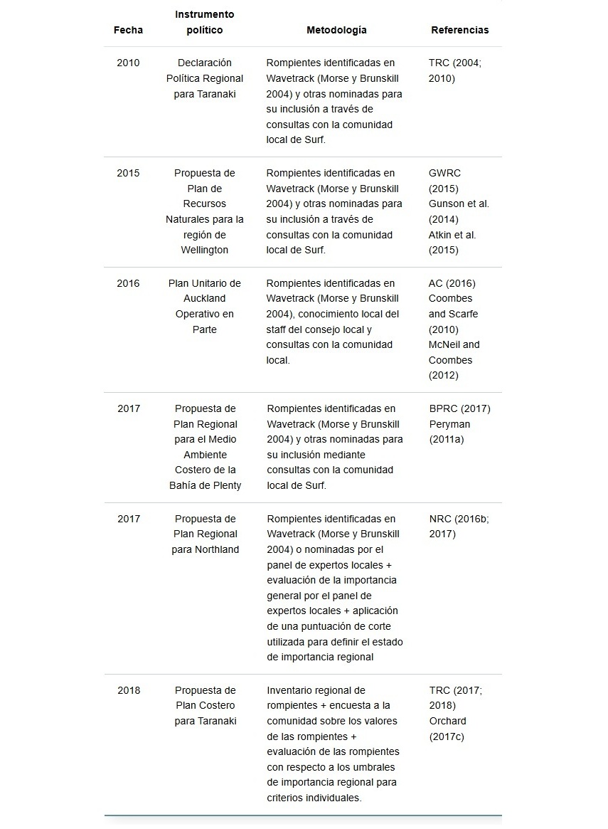 Declaraciones políticas regionales y planes reglamentarios de Nueva Zelanda que han identificado rompientes de importancia regional, así como las metodologías utilizadas para su identificación. Fuente: Atkin, E., Bryan, y otros. “Management Guidelines for Surfing Resources”. Raglan, Aotearoa New Zealand: Aotearoa New Zealand Association for Surfing Research. 2019.
