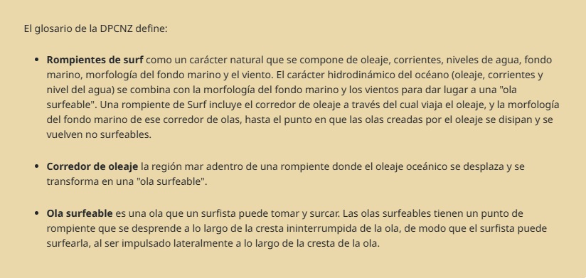 Ahora bien, la DPCNZ no proporciona criterios para definir lo que constituye una Rompiente de Importancia Nacional, ni adopta ninguna posición sobre la clasificación de las rompientes y su importancia (es decir, importancia nacional, regional o local). La base para la selección de las 17 Rompientes de Importancia Nacional fue la Guía de Surf Wavetrack de Nueva Zelanda, en la que se seleccionaron rompientes con una puntuación de 10 sobre 10 en un ranking definido por el autor. La falta de orientación nacional para aplicar estas políticas ha dado lugar a diversos enfoques regionales.